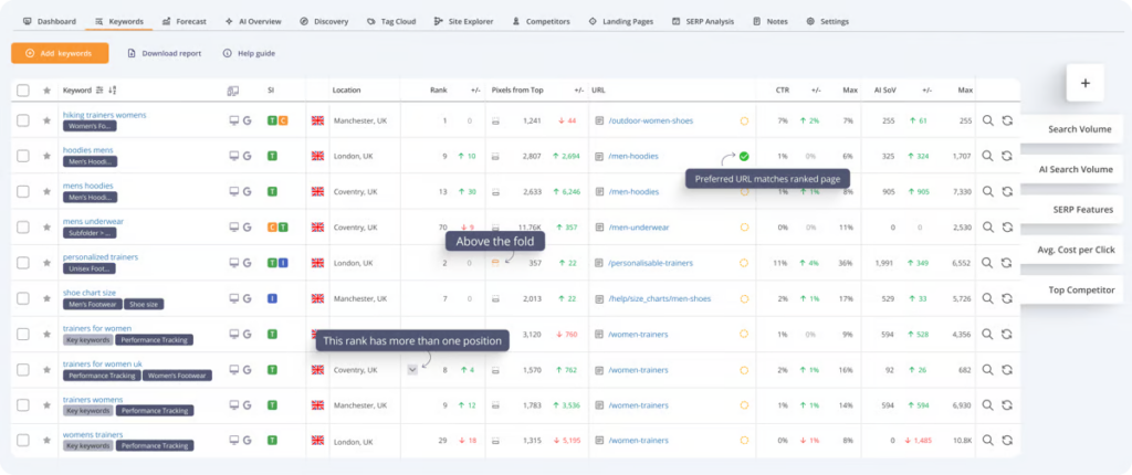 Both tools offer competitive insights, but in different ways. AccuRanker’s Share of Voice (SoV) metric provides a useful view of your website’s organic visibility compared to competitors. You can track competitor keyword positions and benchmark performance.