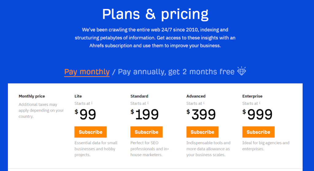 * Ahrefs does not offer a free trial. Ahrefs Webmaster Tools provides limited free access to Site Explorer and Site Audit for verified site owners.