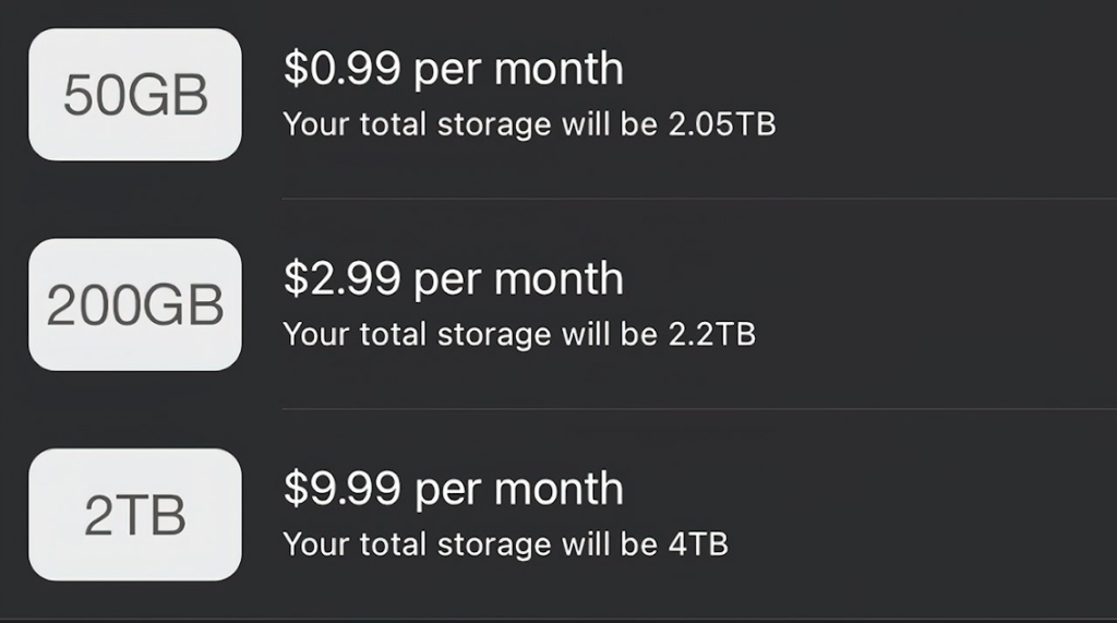 • Available storage plans range from 50 GB ($0.99/month) to 12 TB ($59.99/month); upgrades can be made at any time.