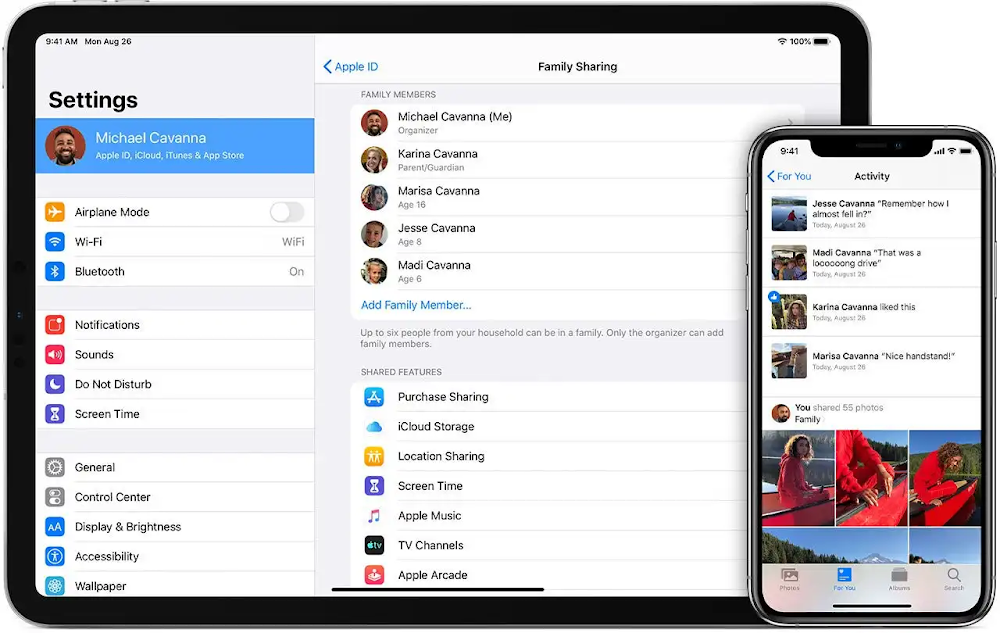• Each member always uses their own Apple Account. Passwords, personal photos, and private files are never pooled together.
